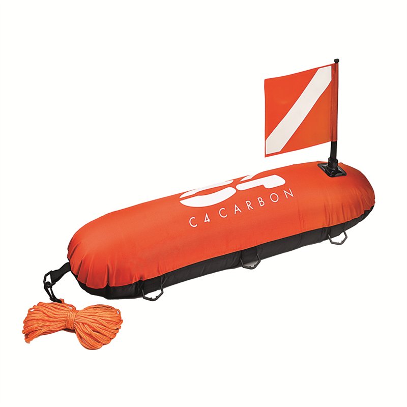 C4 Torpedo is a double chamber cigar-shaped signalling buoy. The internal chamber is made of PVC and the external protection chamber is made of 300D NYLON. The Torpedo buoy has 6 Nylon D-rings at the bottom of the buoy. The buoy is equipped with a signal flag and a floating line with double nylon snap hooks.